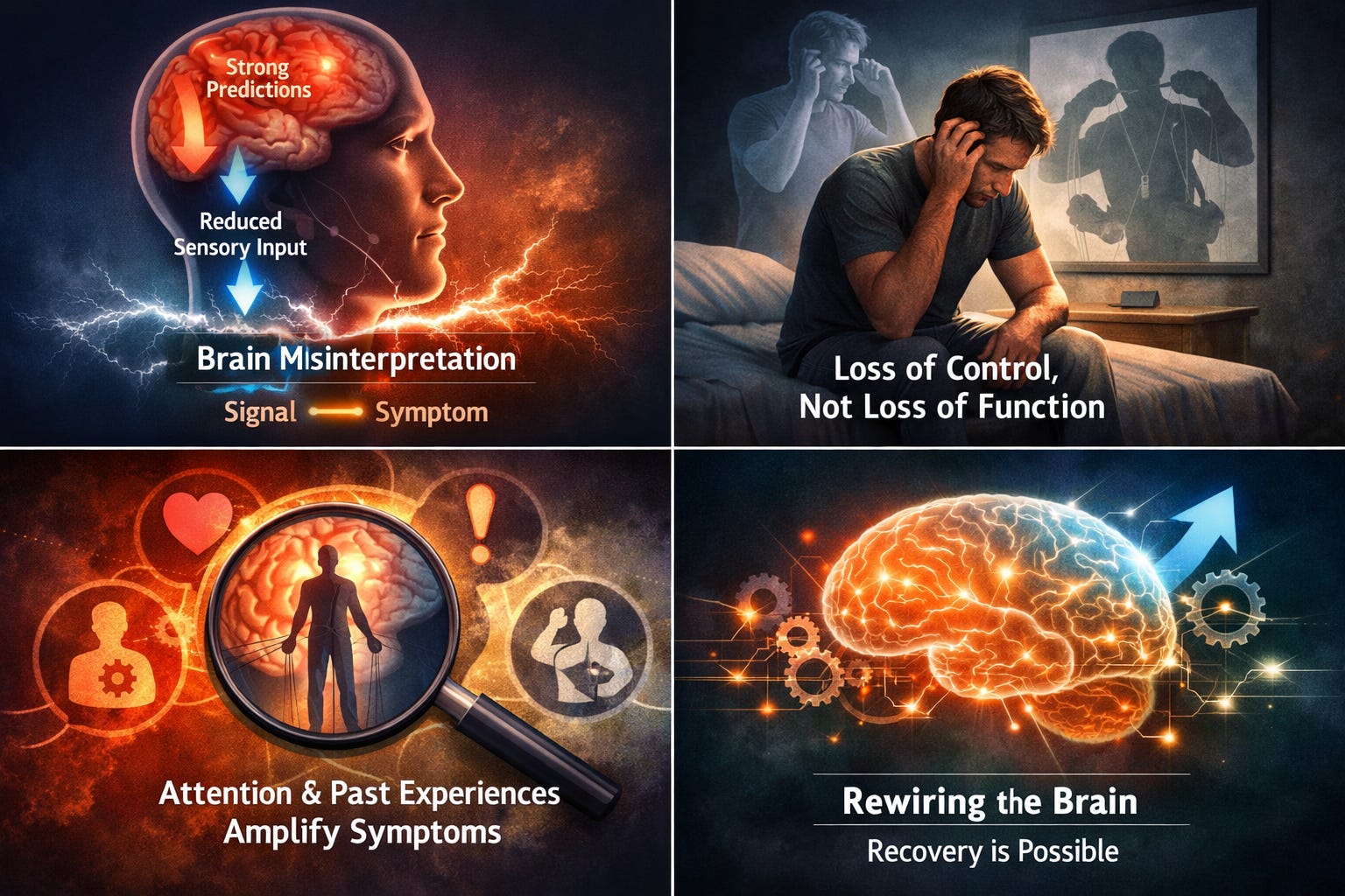 In FND, attention becomes overly focused on the body. Normal sensations—subtle shifts in balance, muscle tension, internal signals—become magnified. The brain assigns too much importance to these signals, increasing their “precision.”